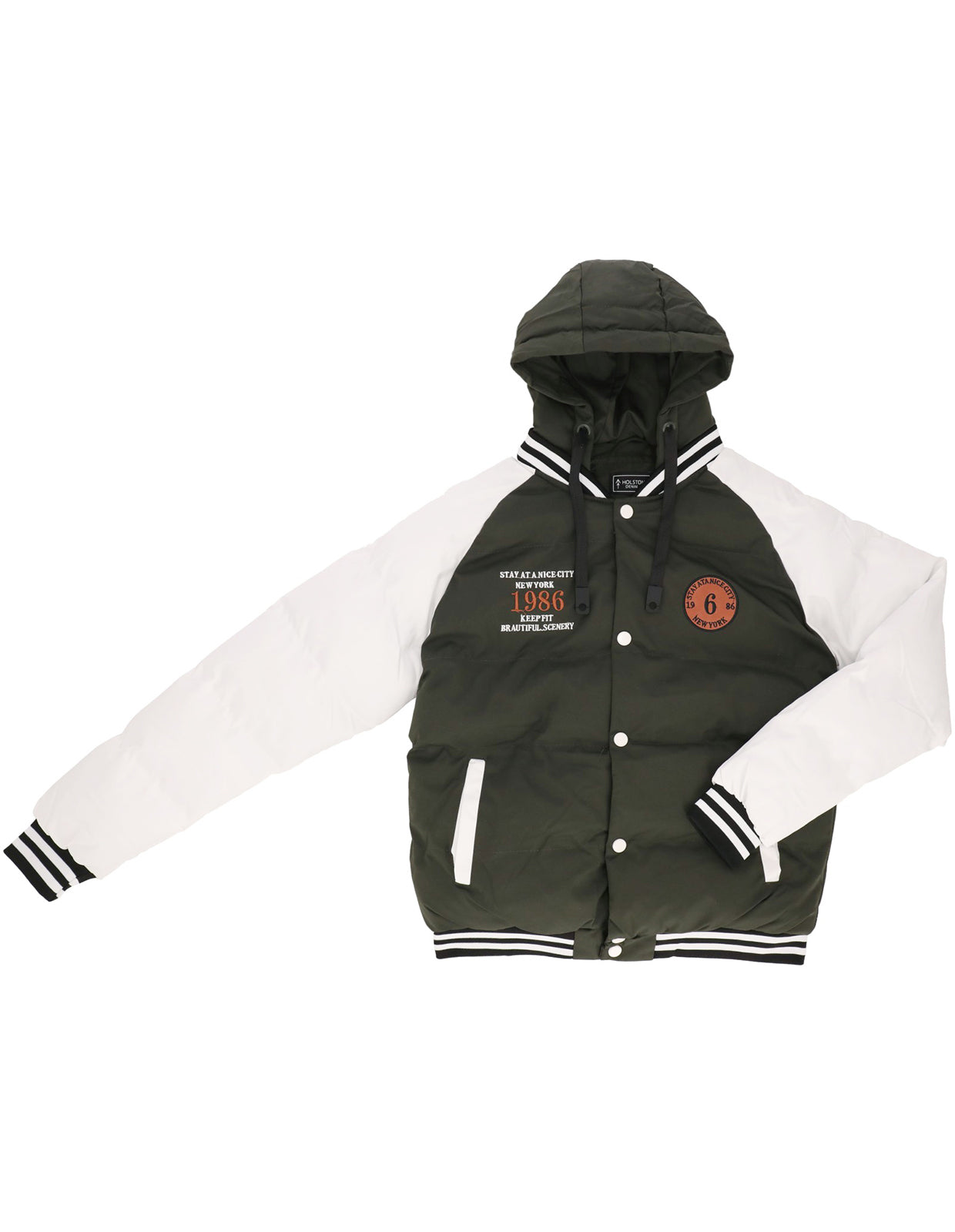 Incluye una capucha ajustable para mayor protección y un cierre frontal con broches que facilita su uso. Sus puños y pretina acanalados añaden ajuste y comodidad, manteniendo la forma y proporcionando un toque auténtico del estilo varsity.